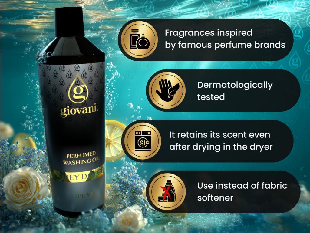 Giovani® is an exclusive and luxury brand of laundry perfumes. We have taken great care to ensure their high quality. When developing these fragrances, it was important for us to achieve their strong intensity and long lasting durability, so that we could speak of Giovani® as the finest quality laundry perfume brand on the market. Their great advantage is that they don't clog the washing machine, they don't leave a greasy residue and they don't stain clothes. Thanks to the content of some substances, our oils also take care of the colour of your laundry. They are vegan, free of dioxane, SVHC, parabens, tensides, PBT/vPvB substances, heavy metals, polluting residues, microplastics or nanoplastics. What adds to the uniqueness of the Giovani® brand is its luxurious design. We also pride ourselves on delivery within 24 hours and fast customer service. |