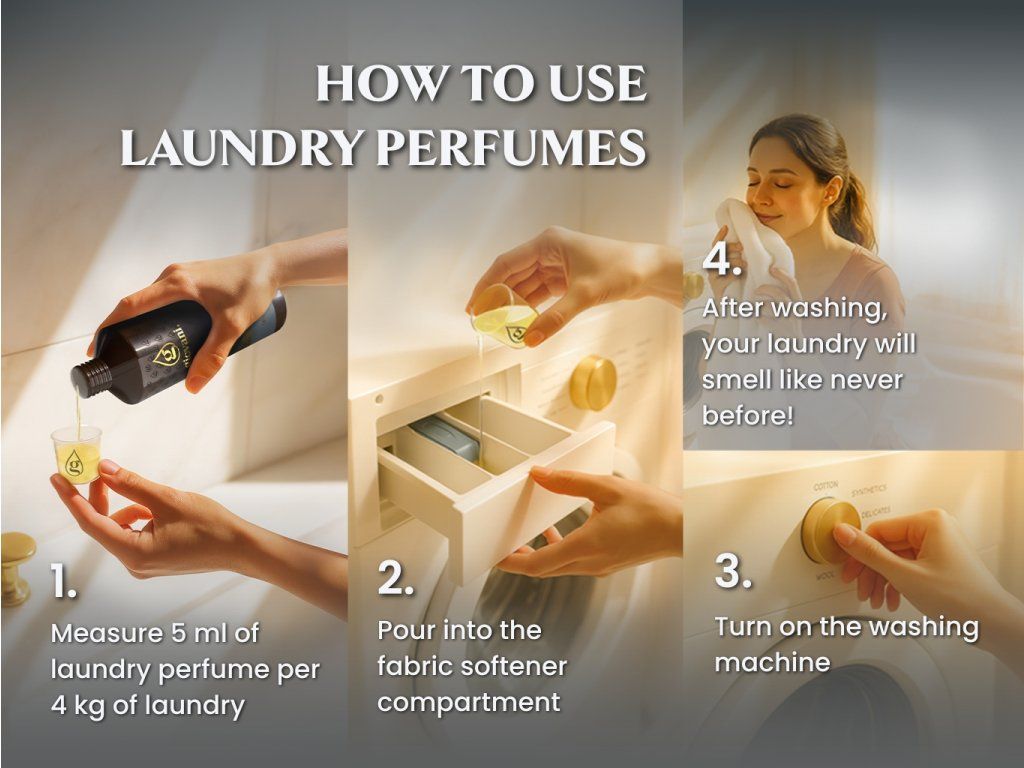 Usage: Pour 5 ml of concentrate into the fabric softener container. This amount is one dose for 4 kg of laundry. The concentrate is not diluted. For dosing, you can use the cap of Giovani® laundry perfume, which corresponds to 3 ml; we recommend using double the amount. To make dosing even more convenient, you can purchase a measuring cup with our logo or a pump for dosing. Just use a small amount and your laundry will be perfectly fragrant!